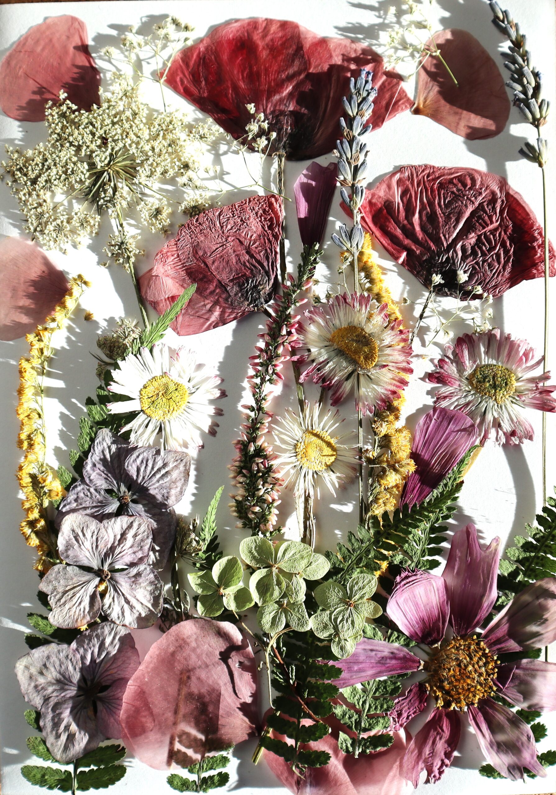 Rośliny w zestawie: maki, stokrotki, hortensja, onętek, gipsówka, nawłoć, lawenda, płatki maków, paproć….